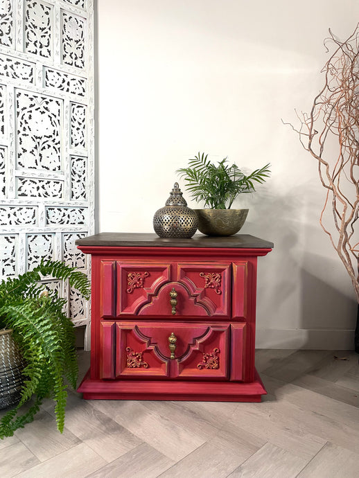 Hand painted boho bedside cabinet. Red pink drawers, Moroccan style