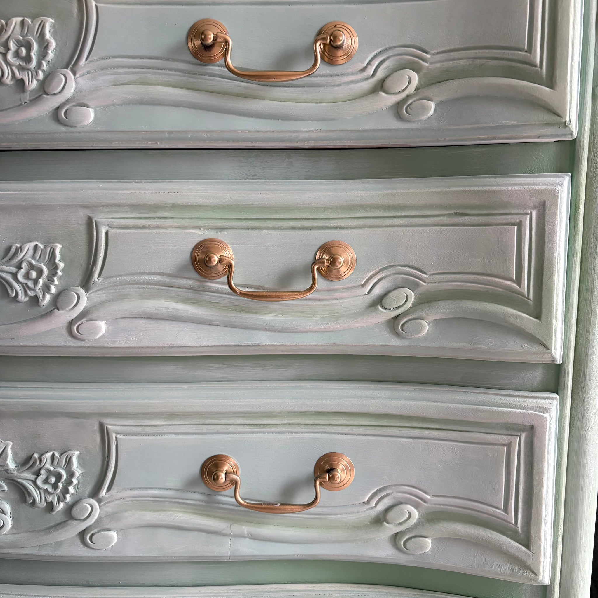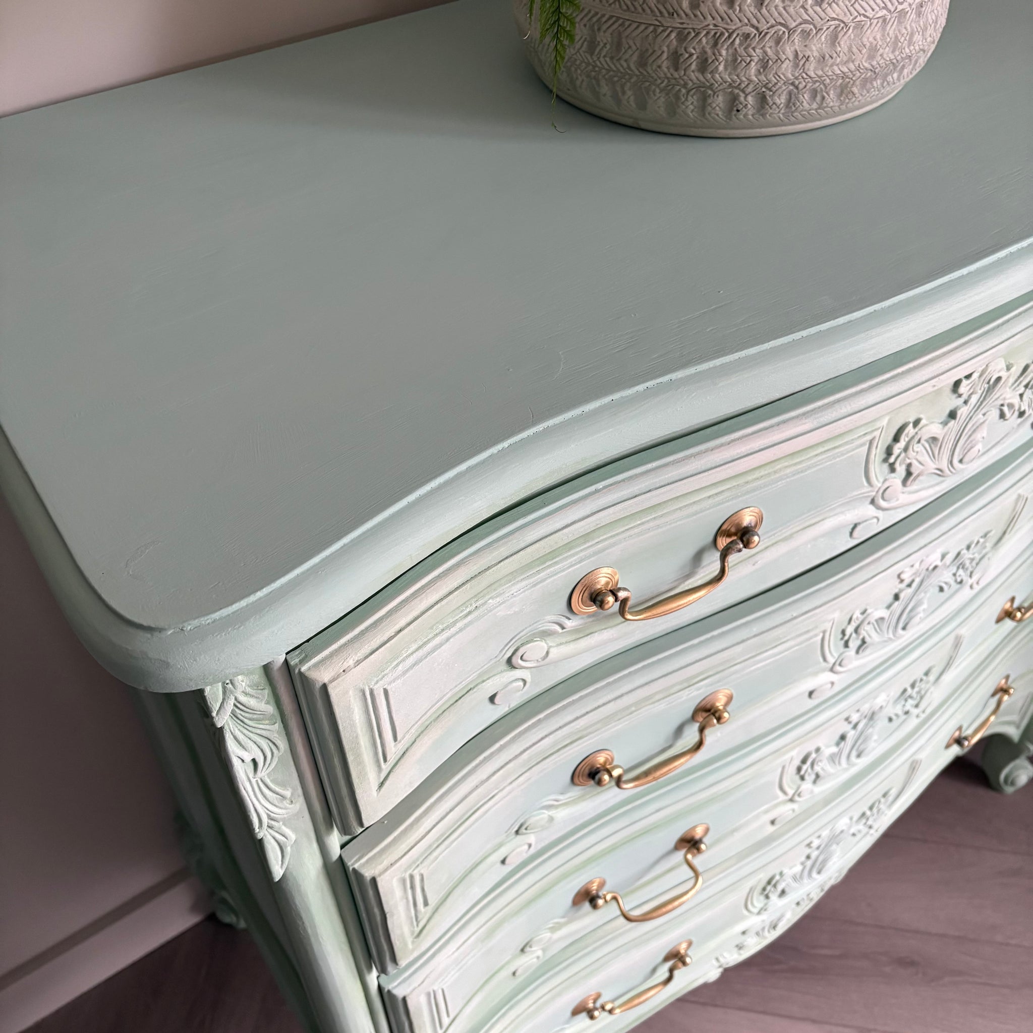 Add timeless French elegance to your home with this beautifully hand painted French-style chest of drawers, finished in a soft mint green with subtle blended tones that give the piece real depth and character.