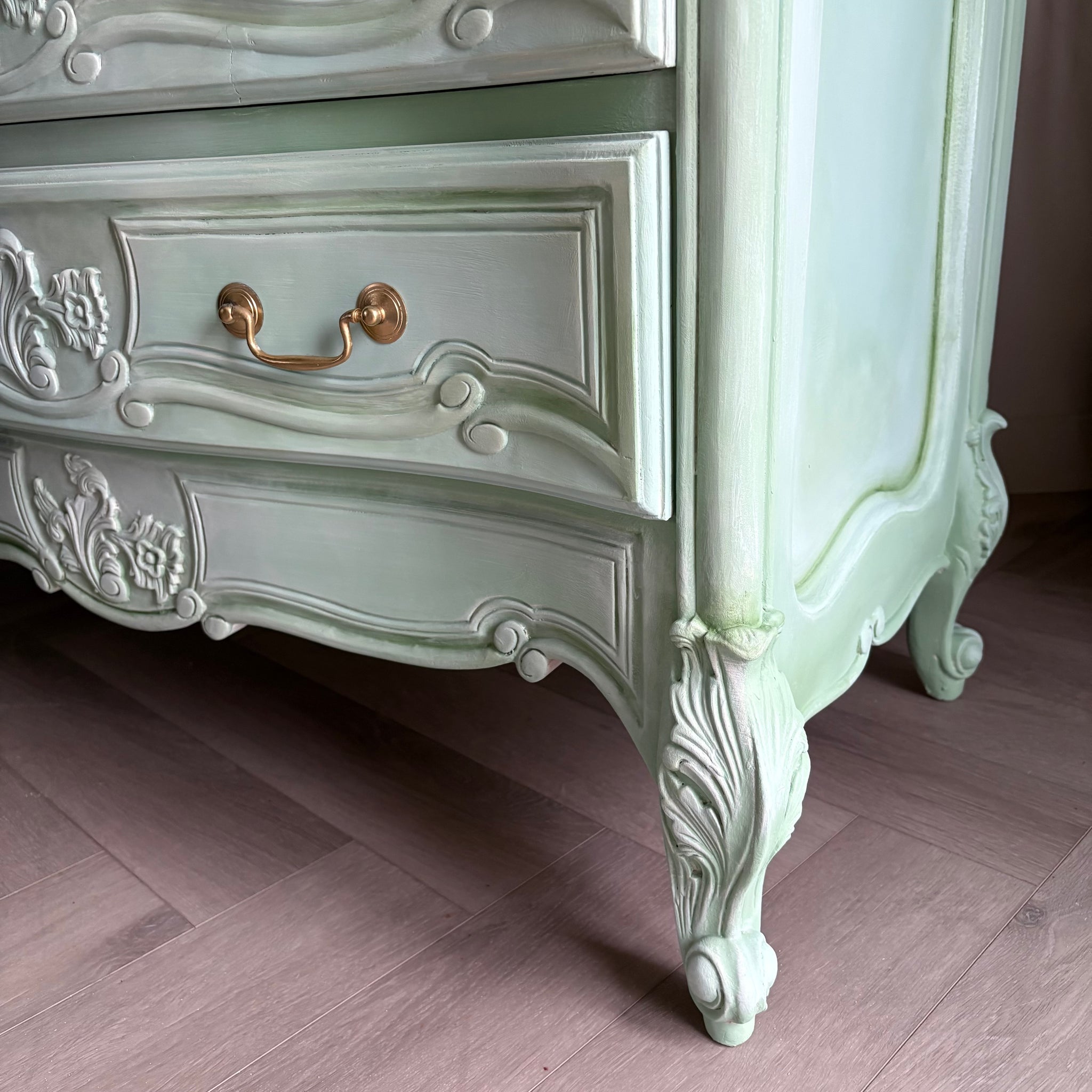 Elegant brass handles and classic cabriole legs complete the look, blending traditional French charm with a fresh, contemporary feel.