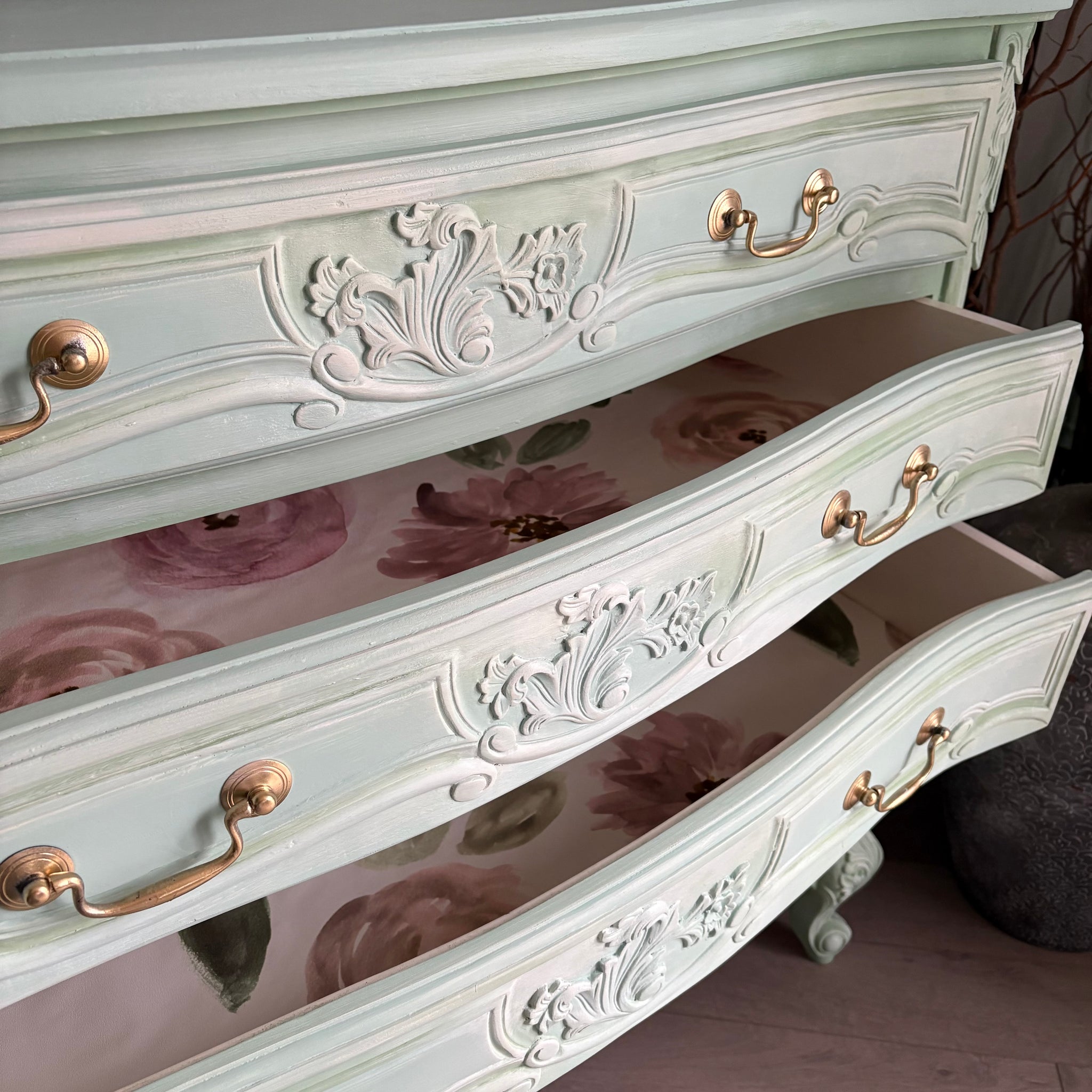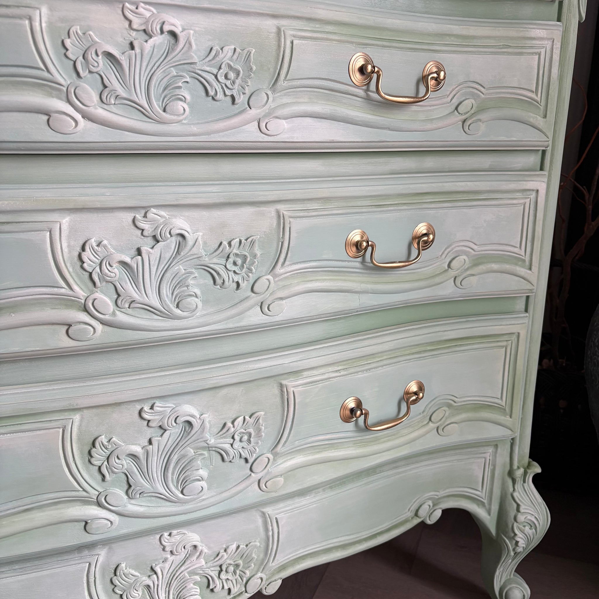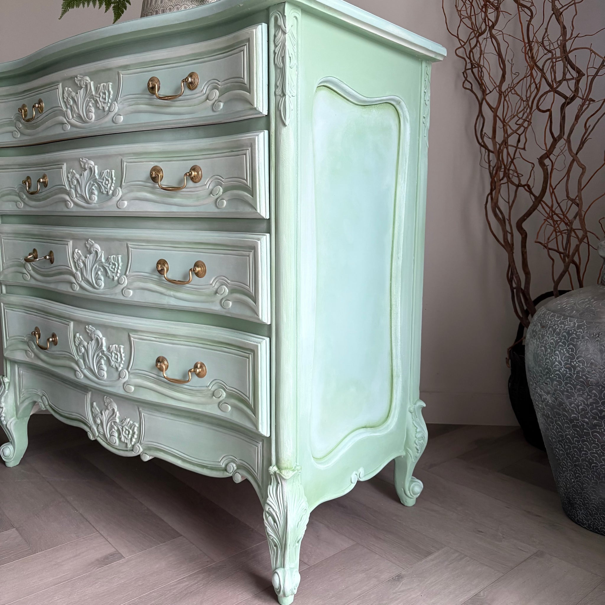 Rather than a flat, uniform colour, this chest features gentle variations and soft shading, carefully blended by hand to enhance the carved details and flowing curves. These delicate blends ensure every angle looks slightly different, making this a truly one-of-a-kind piece.