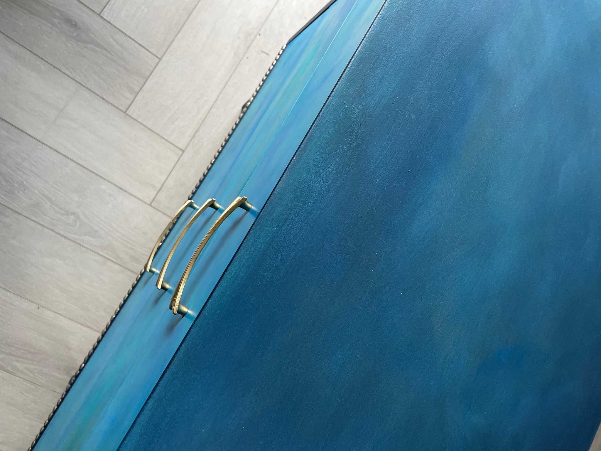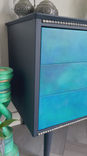 Add a pop of colour and timeless charm to your home with this beautifully hand painted vintage chest of drawers. A true statement piece, this vintage mid century modern design has been lovingly upcycled in a bold ombre blue finish, blending rich tones from deep navy to vibrant turquoise.