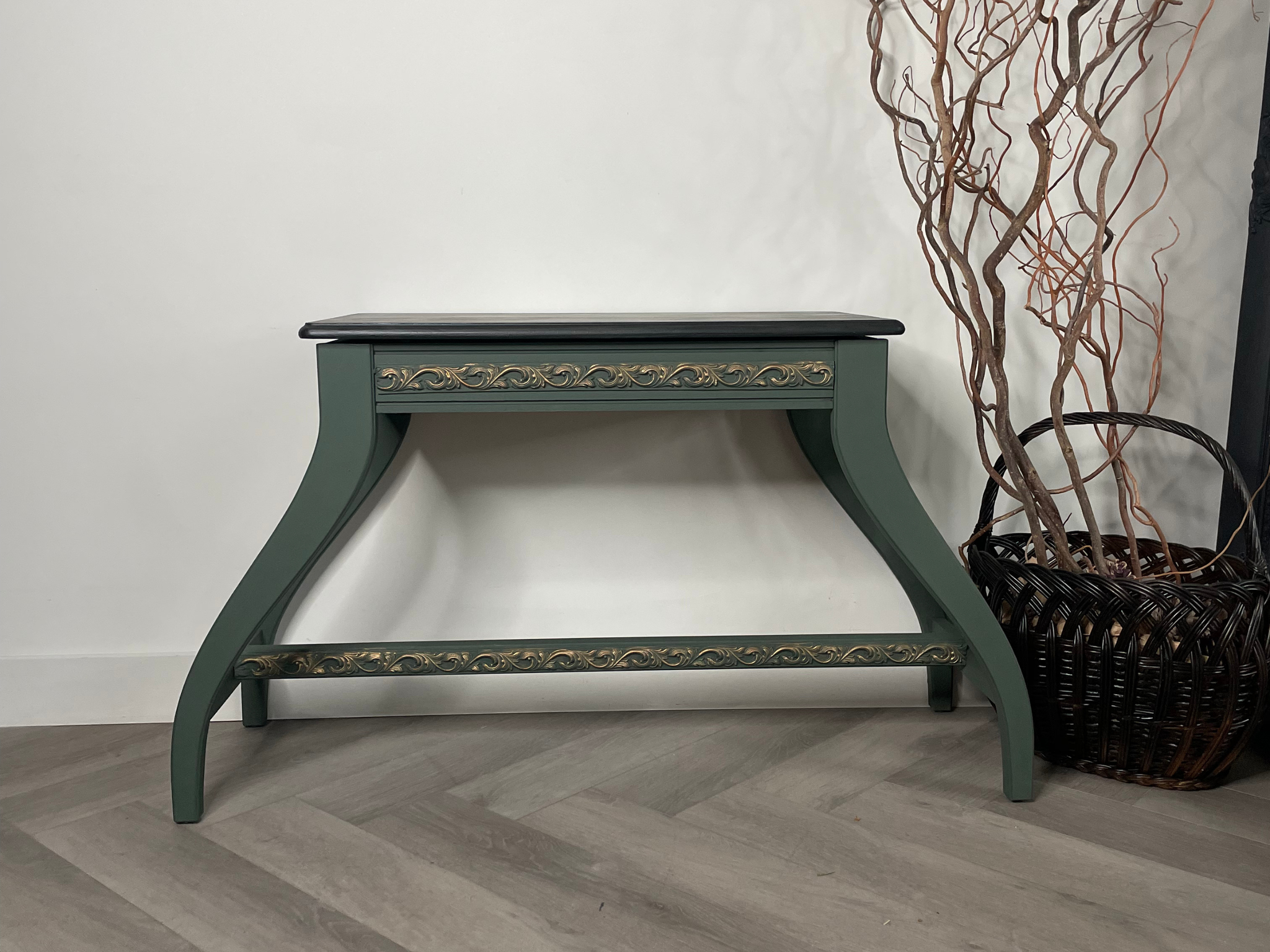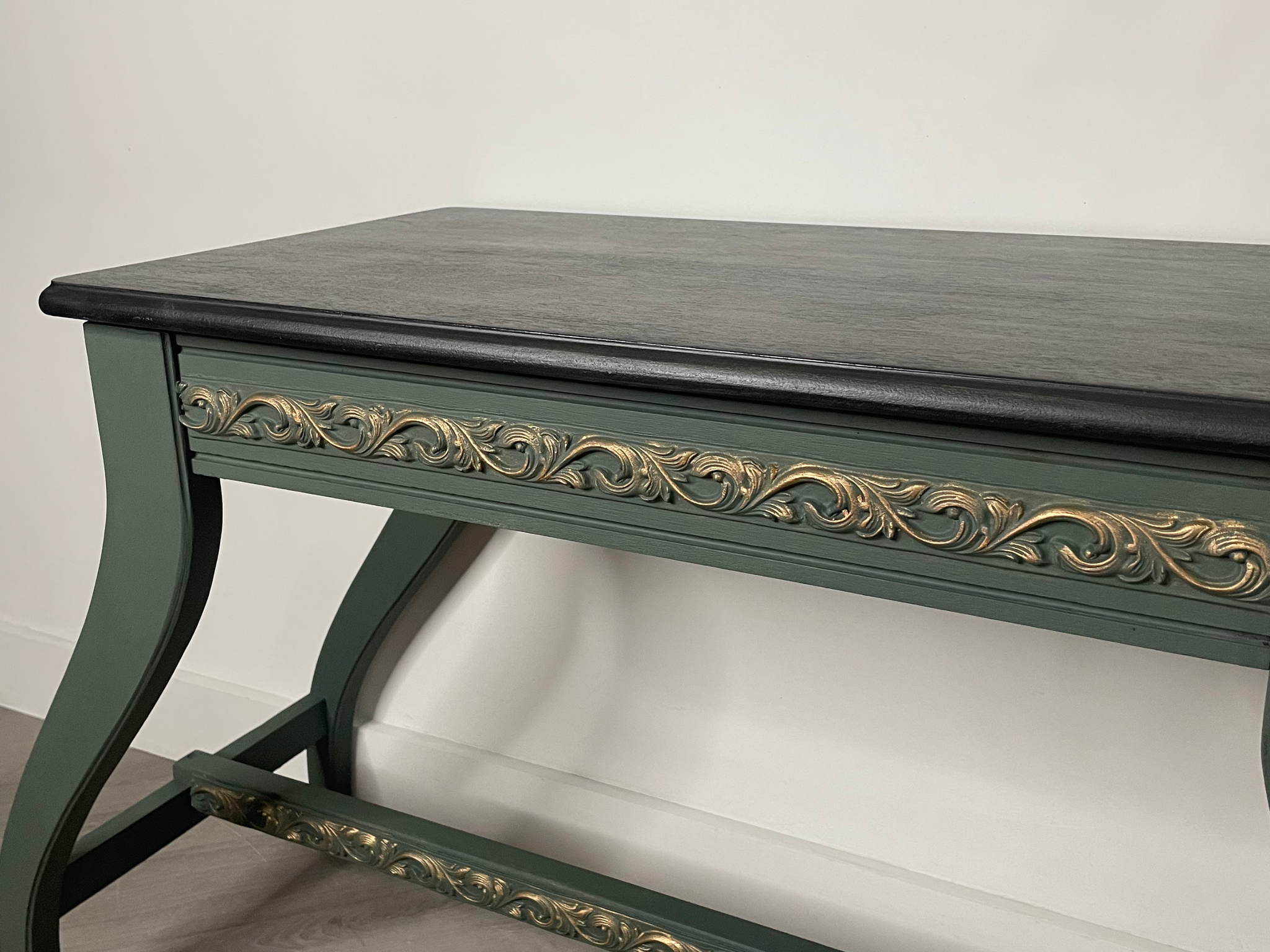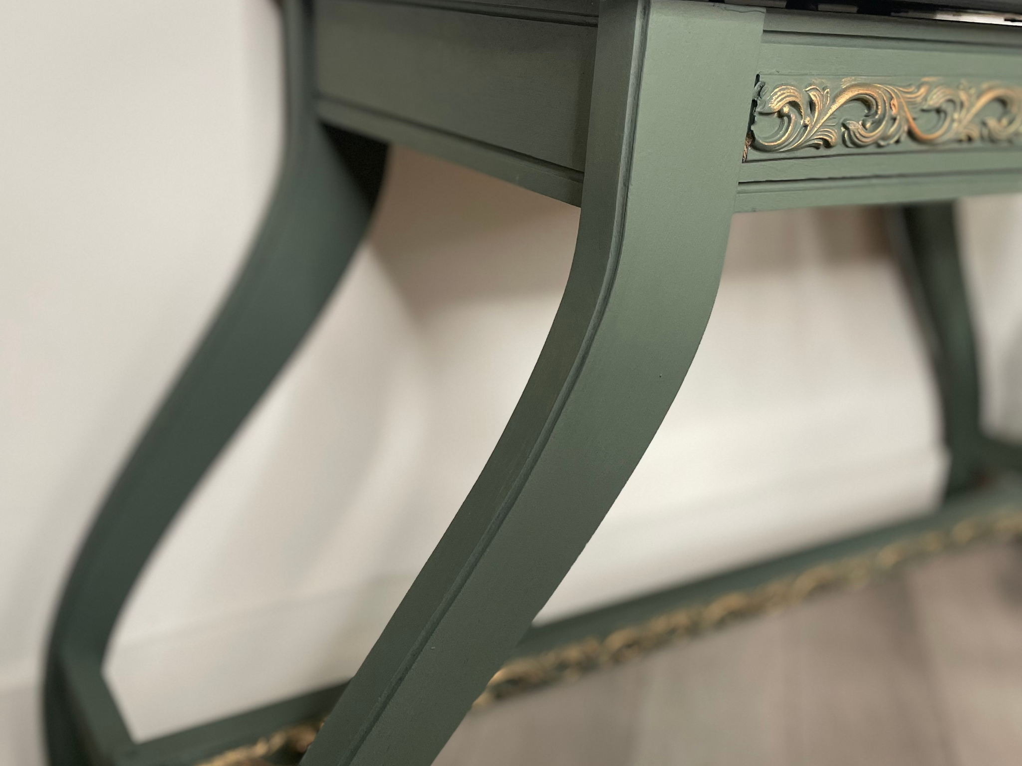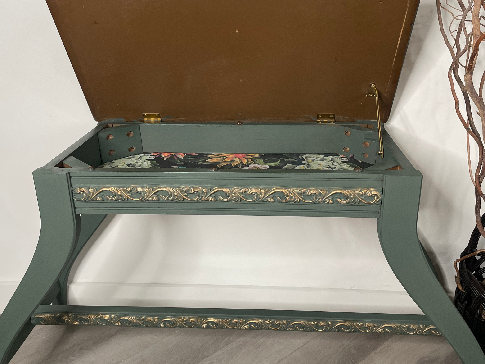 Finished in a dark green with elegant gold scroll detailing, this bench blends timeless design with modern functionality. The lift-top seat opens to reveal hidden storage, beautifully lined with a floral interior—perfect for keeping your space organized while adding visual interest.
