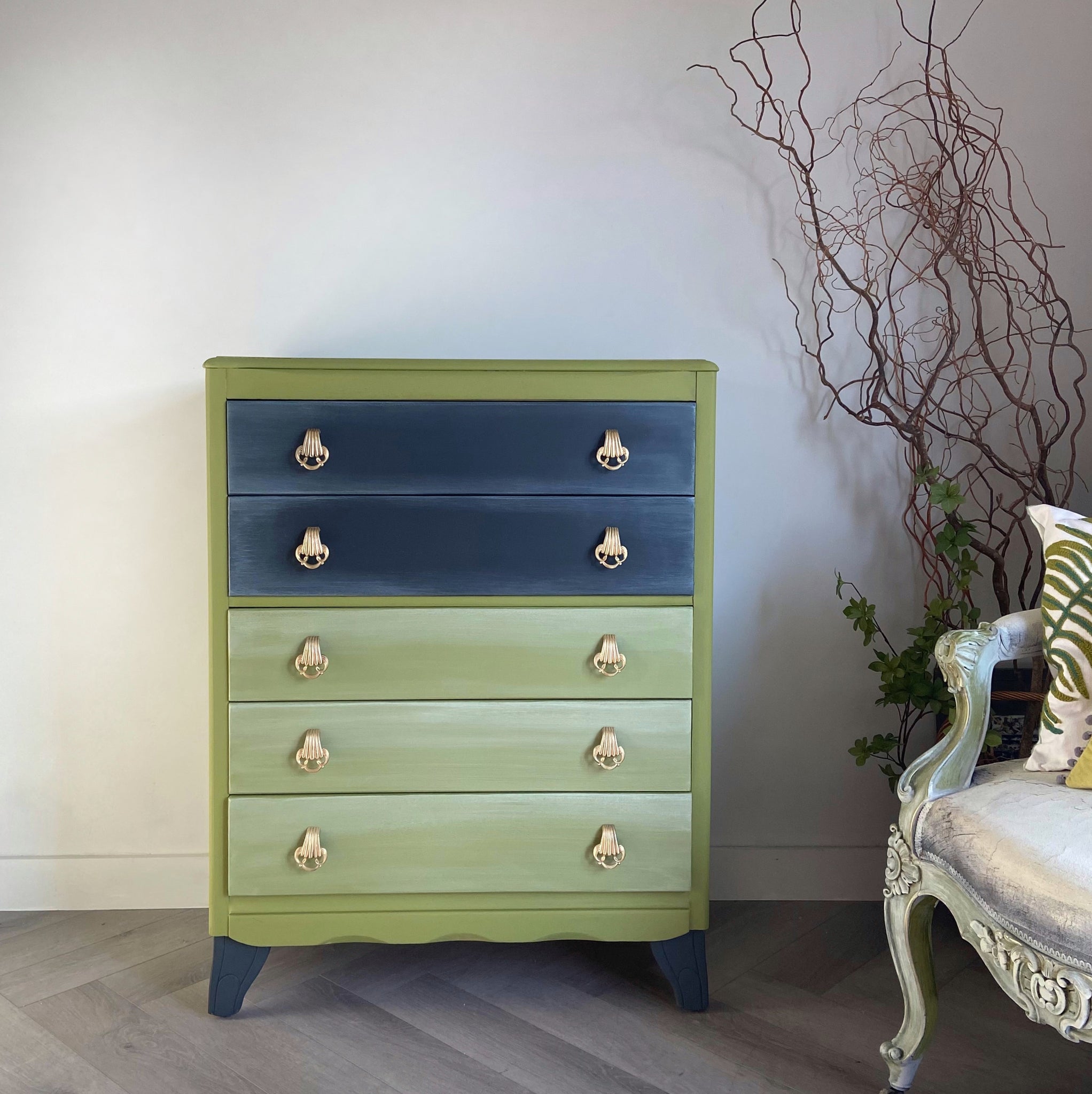 Vintage Lebus chest of drawers hand painted in a beautiful olive shade combined with an almost black to compliment. A light wash has been applied over drawer fronts to soften the colours and give an individual twist.