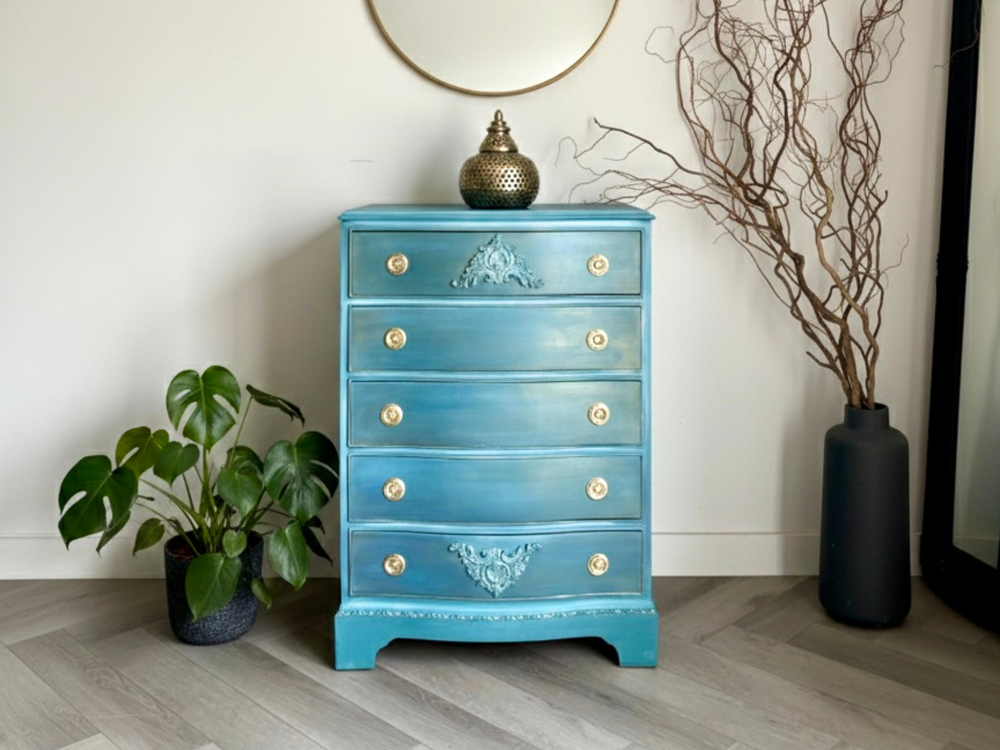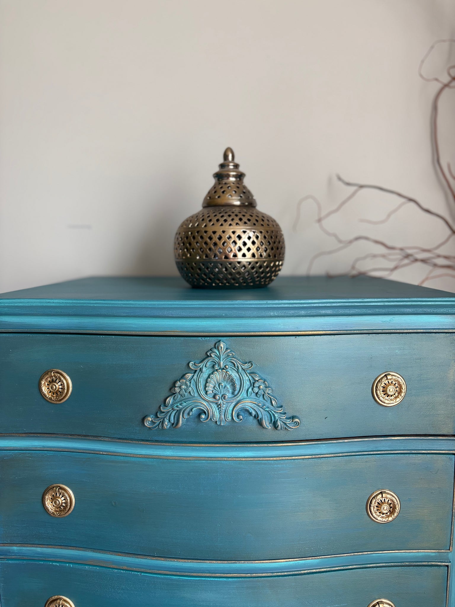 This stunning hand painted vintage chest of drawers has been lovingly restored and transformed into a true statement piece. Finished in a rich turquoise blue with subtle gold accents, it blends timeless elegance with modern boho style.