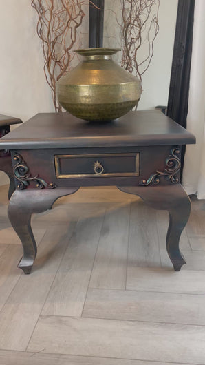 Each table features delicate carved detailing and elegant cabriole legs, enhanced by a moody, multi-layered paint finish that blends deep tones with glimmers of bronze and gold. These tables are not just furniture – they’re art pieces, carefully refinished to bring a touch of sophistication and individuality to your space.