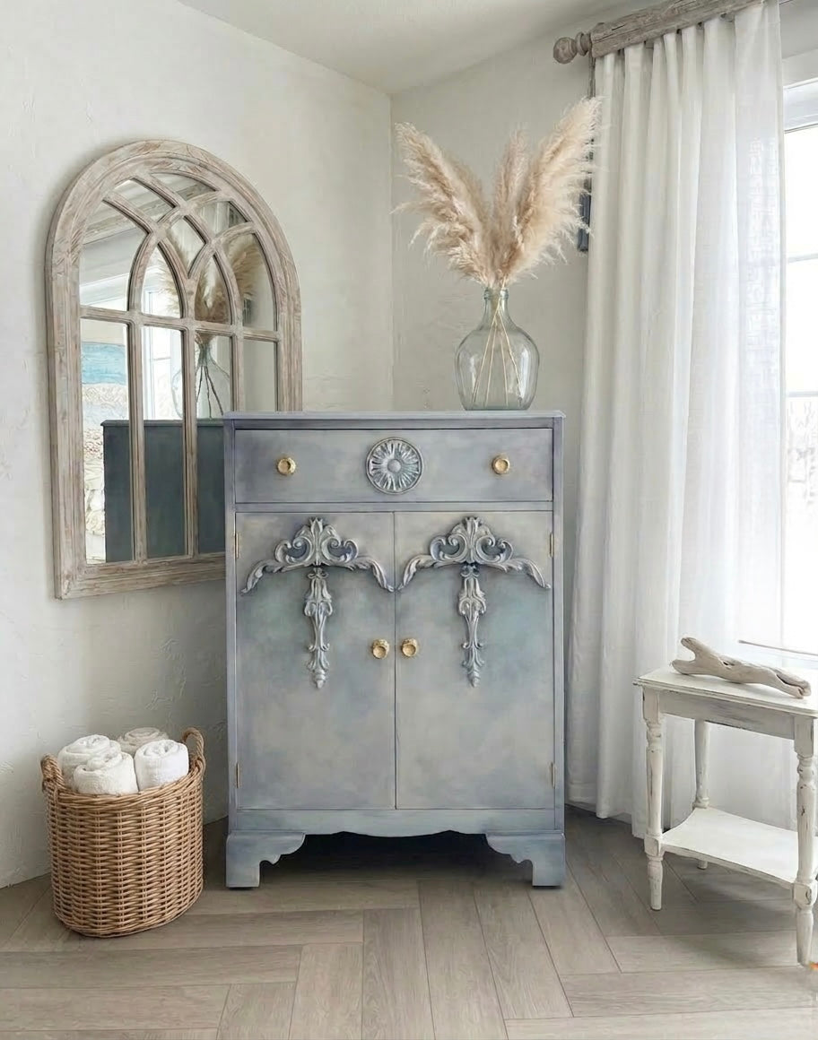 The tallboy design offers practical storage with a spacious drawer and double cupboard doors, making it ideal for clothing, linens, or everyday essentials. Its distressed finish highlights the antique character, while the decorative mouldings add statement detail.